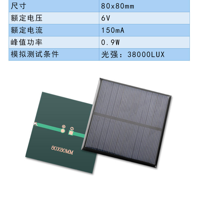 แผงโซลาร์เซลล์ 80X80MM โพลีคริสตัลไลน์ 6V 150MA แผ่นอีพ็อกซี่เซลล์แสงอาทิตย์ประสิทธิภาพสูง