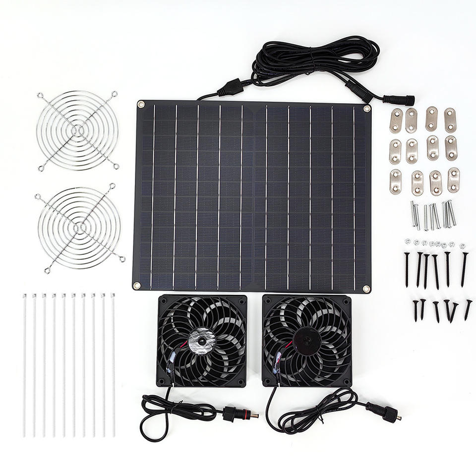 แผงโซลาร์เซลล์พร้อมพัดลมคู่ 25W 12V โมโนคริสตัลไลน์สำหรับบ้านสัตว์เลี้ยง โรงเรือนเลี้ยงไก่ กันน้ำ IP65