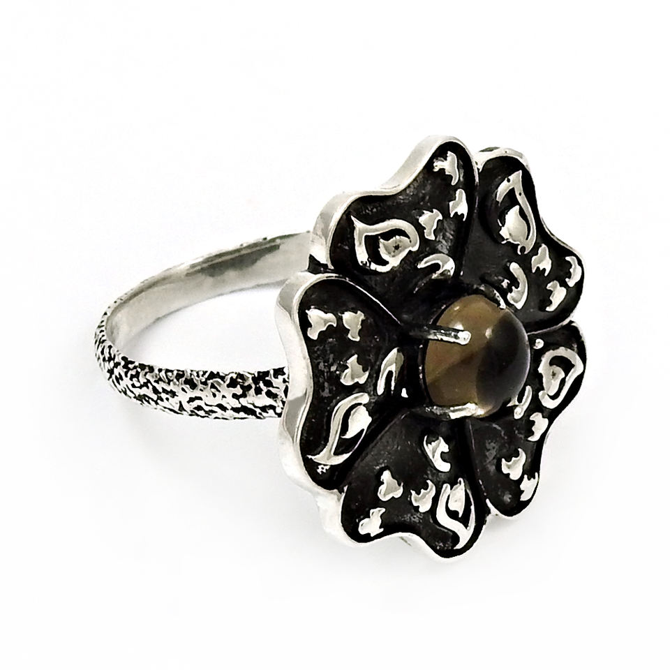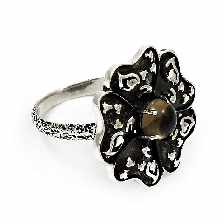 แหวนเงินแท้925ออกซิไดซ์สเตอร์พลอยควอตซ์สโมคกี้ธรรมชาติแหวนดอกไม้ดีไซน์ไม่เหมือนใครงานแฮนด์เมดเครื่องประดับชั้นดีผู้ส่งออก