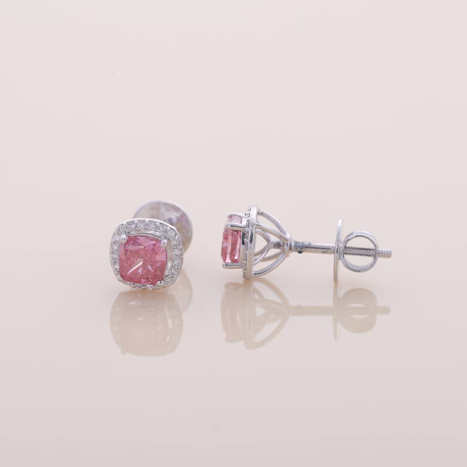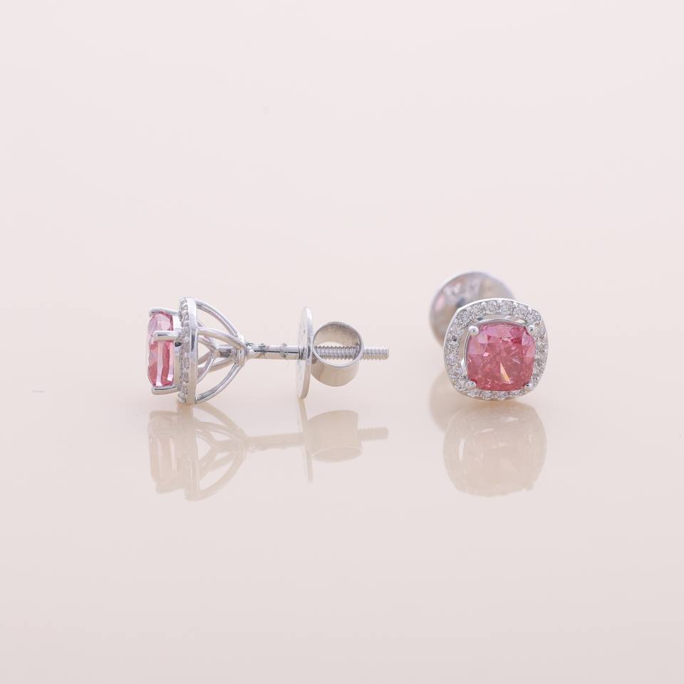 ต่างหูเงินแท้ 925 ประดับเพชรชมพูทรงคุชชั่น 1.68 กะรัต เพาะเลี้ยงในห้องปฏิบัติการ พร้อมวงแหวนเพชรแบบ Halo ตัวเรือนชุบโรเดียม ฝังเพชรแบบ Micro Pave ได้รับการรับรองจาก IGI