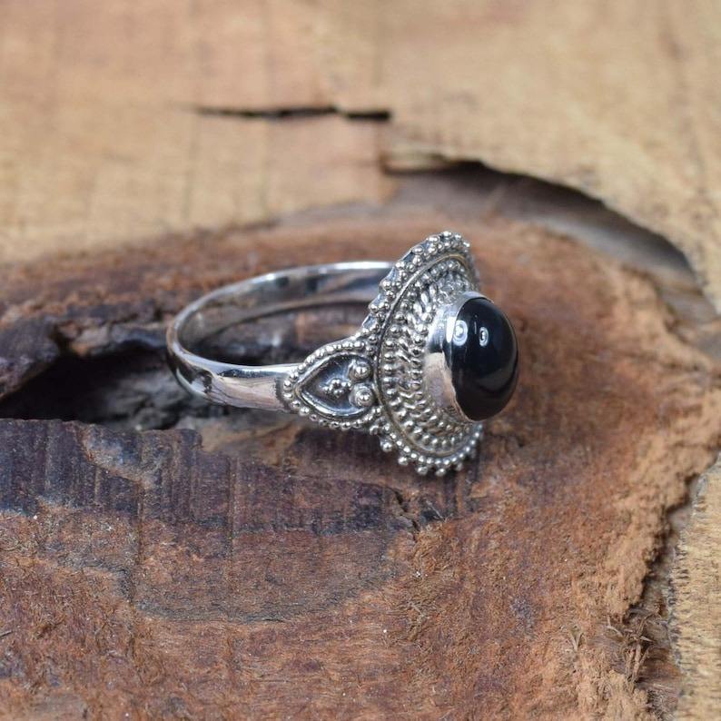 แหวนแฮนด์เมดสไตล์โบโฮสีเงินสเตอร์ลิง925แท้สีดำพลอยโอนิกซ์ธรรมชาติพร้อมเพชรทรงรีสำหรับงานแต่งงานเครื่องประดับแสตมป์925