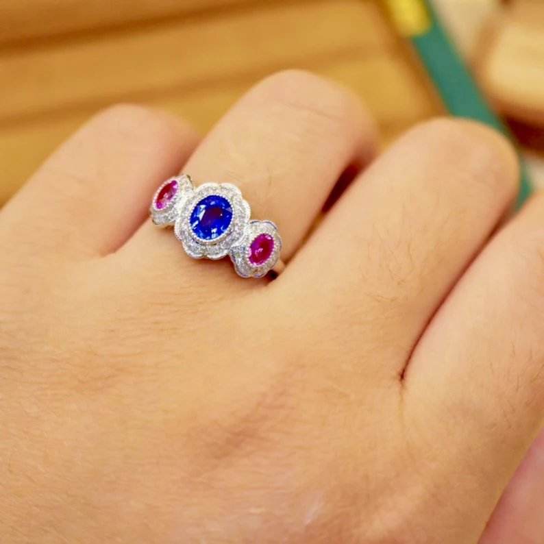 แหวน925สเตอร์ลิงเงินสไตล์คลาสสิกที่ไม่ซ้ำกันการออกแบบที่ทันสมัยทองแทนซาไนต์ทรงรีตัดวงรีสีทองงานแต่งงานของขวัญครบรอบ
