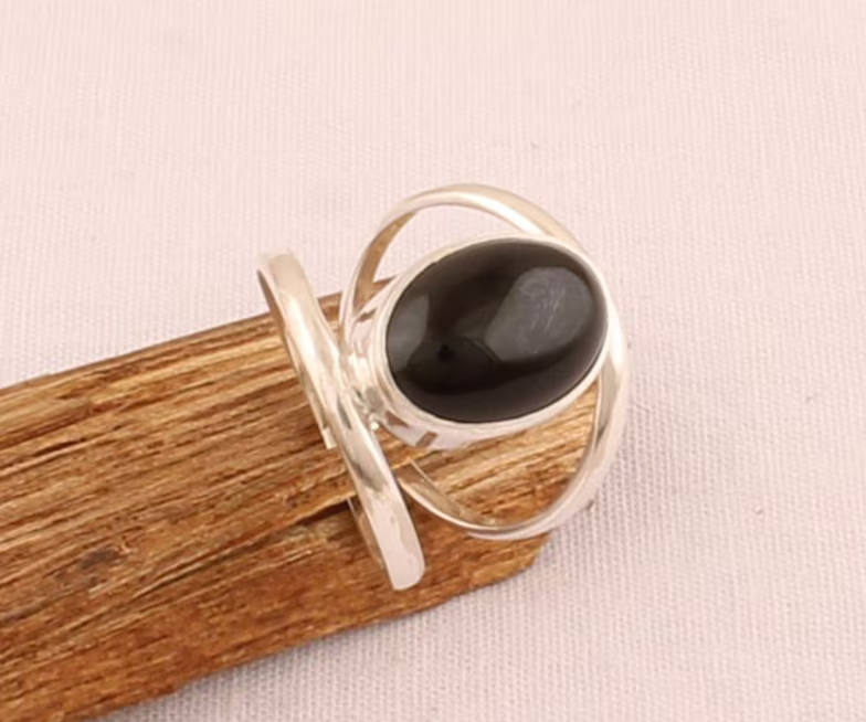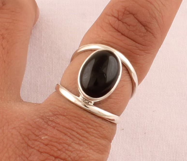 925แข็งแหวนเงินสเตอร์ลิงคู่สำหรับผู้ชายผู้หญิงทำด้วยมือพลอยสีดำนิลรูปไข่แฟนซีสายคาดสองชั้นของขวัญของเธอ