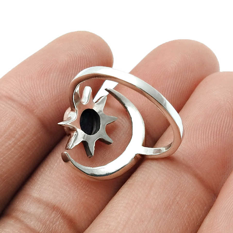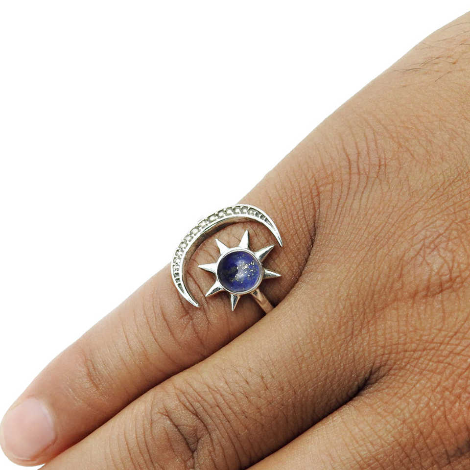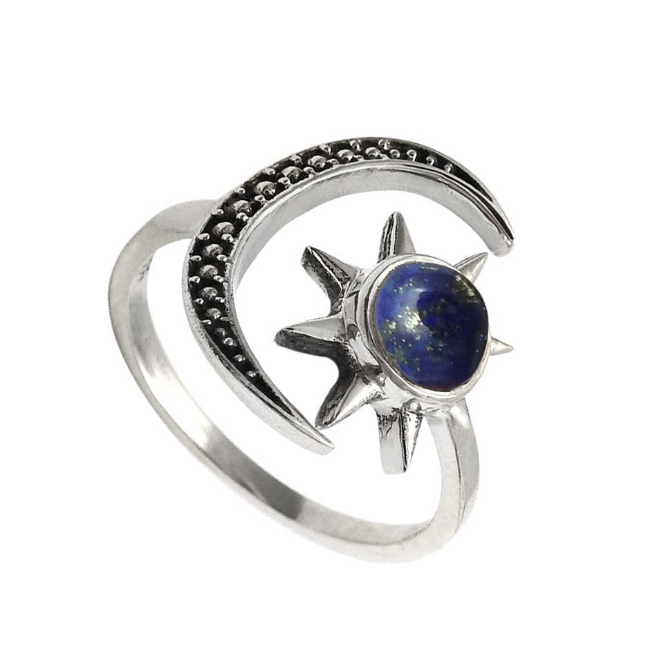 แหวนเงินแท้ 925 ประดับด้วยพลอยลาพิส ลาซูลี ทำมือ ดีไซน์พระอาทิตย์และพระจันทร์ น้ำหนักเบา สไตล์โบโฮ