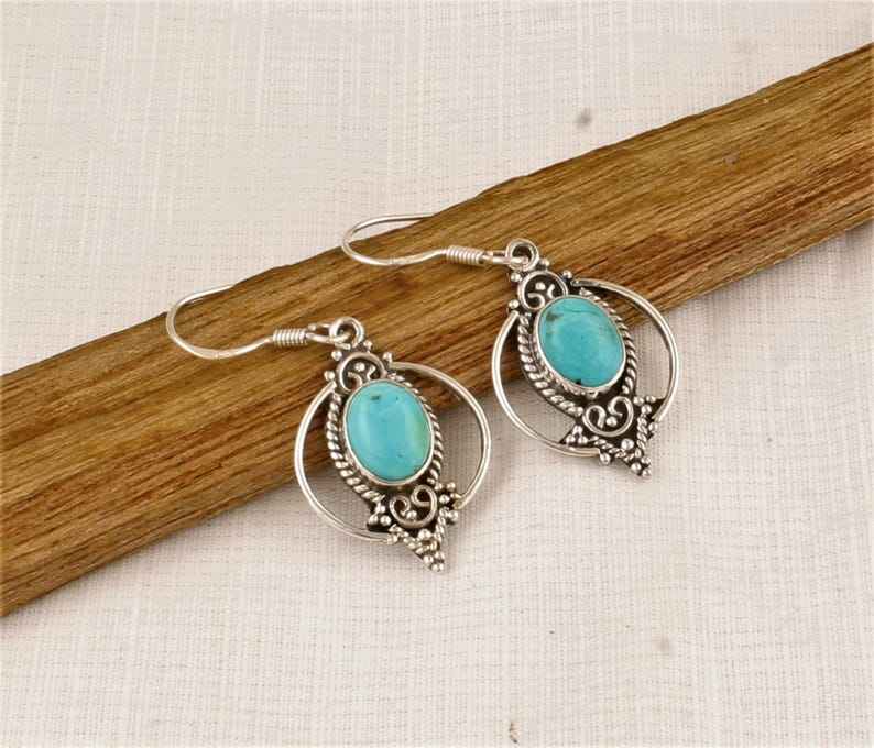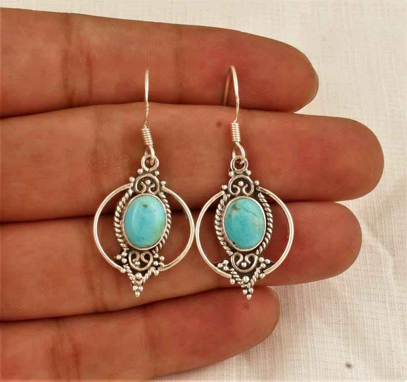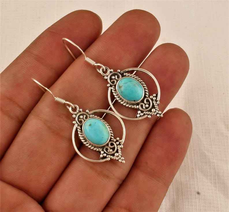 925แข็งสเตอริ่งชุบเงินสไตล์โบฮีเมียนทันสมัยพลอยเทอร์ควอยซ์สีฟ้าแบบฝาธรรมชาติต่างหูของขวัญคริสต์มาสที่ดีที่สุด