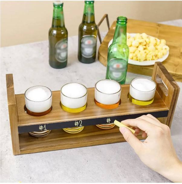 ถาดวางแก้วเบียร์ 4 ใบ ทำจากไม้กระถินณรงค์แท้ พร้อมแผ่นกระดานชอล์คแบบลบได้ ดีไซน์หรูหราสไตล์ยุโรป ผลิตด้วยมือแบบอินเดีย