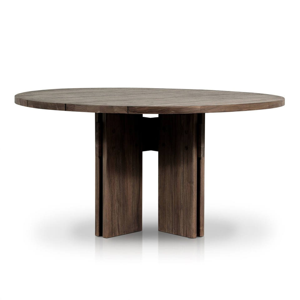 Solid Acacia Wooden Round Shape Liner Design Brown Finish Top New Pedestal Double Pair Legs Modern Home Kitchen Dining Table