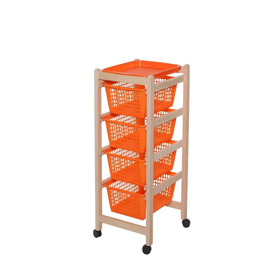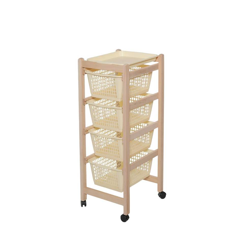 รถเข็นจัดเก็บของทำจากไม้บีชเนื้อแข็ง พร้อมถาดที่ถอดออกได้และตะกร้าพลาสติกปลอดภัยสำหรับอาหาร - สำหรับใช้ในทางเข้าบ้านหรือโรงแรม