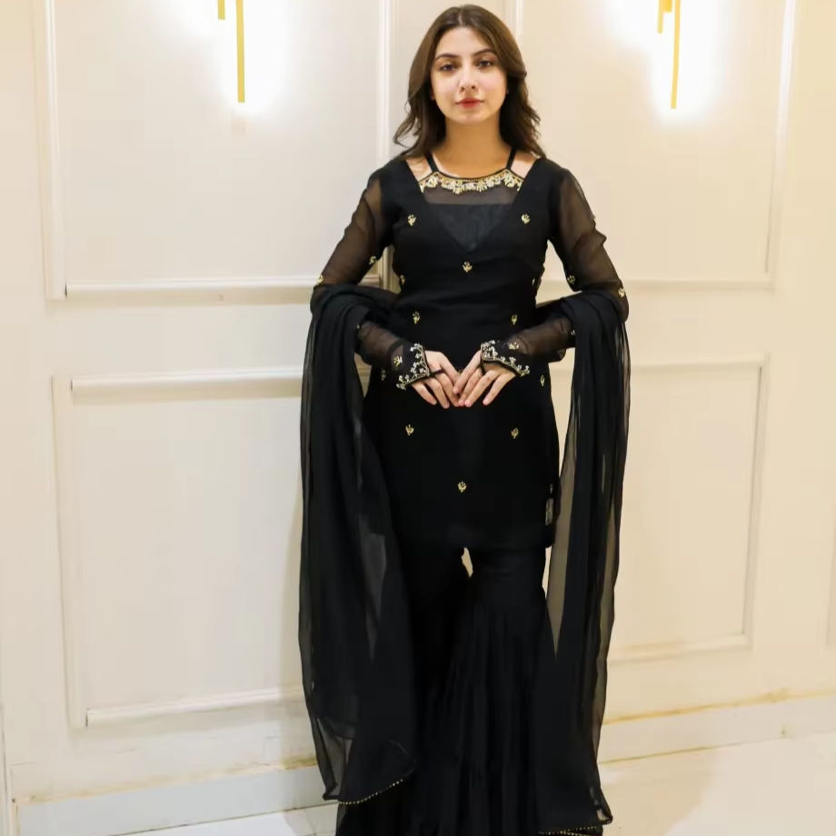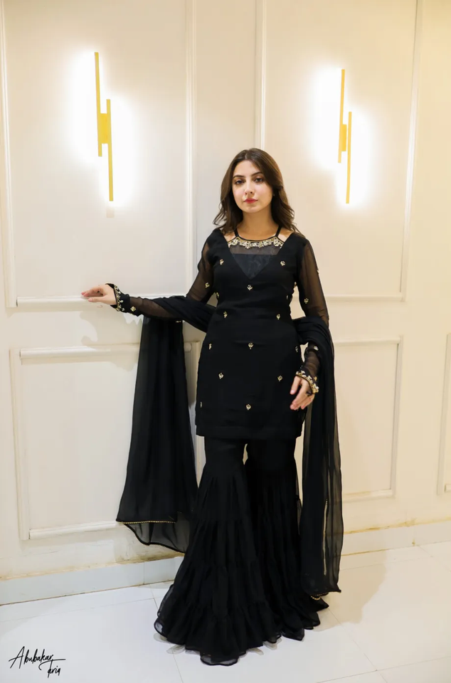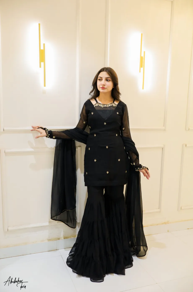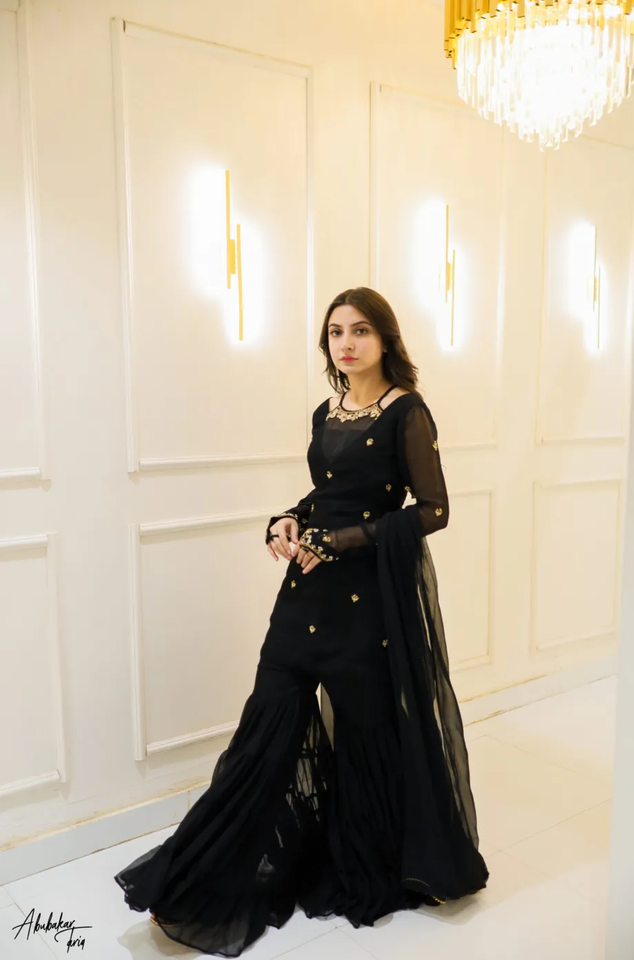 ชุดอินเดียและปากีสถานสีดำล้วนสีทองประดับด้วยเสื้อรูป Gharara และ Dupatta