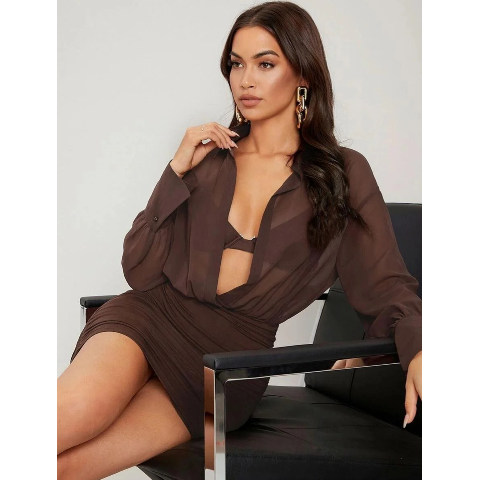 เดรสสั้นสีน้ำตาลกาแฟเข้ม แขนยาว คอวีลึก แต่งระบาย ทรงเซ็กซี่ อาจถือเป็นเดรสสำหรับใส่ไปเที่ยวรีสอร์ทริมชายหาดหรือออกงานกลางคืน