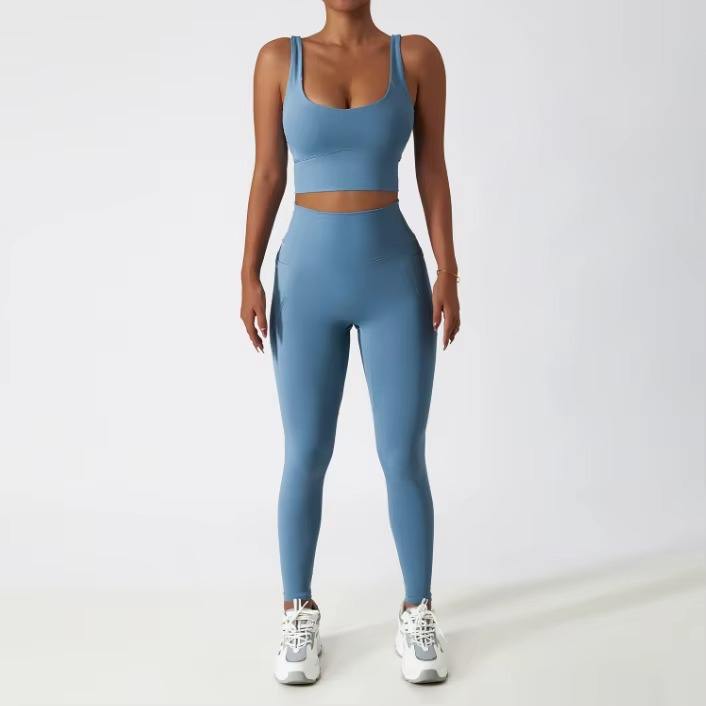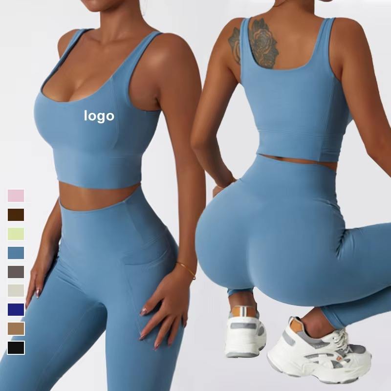 ชุดออกกำลังกายสีพื้น ชุดโยคะ เสื้อชั้นในแบบผูกคอ กางเกงเลกกิ้งไร้ตะเข็บเนื้อนุ่ม ชุดออกกำลังกายสำหรับผู้หญิง ชุดฟิตเนสสำหรับออกกำลังกายในยิม