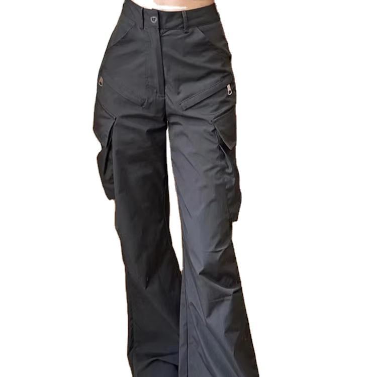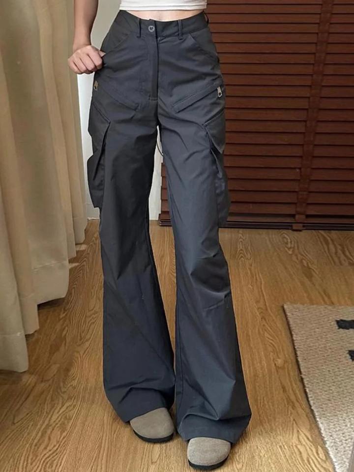กางเกงคาร์โก้ย้อนยุคมีกระเป๋าขนาดใหญ่เอวยางยืดมีเชือกรูดขากว้างสีทึบชุดสตรีทแวร์แบบเรียบง่ายสำหรับนักเรียนนักศึกษาวิทยาลัย