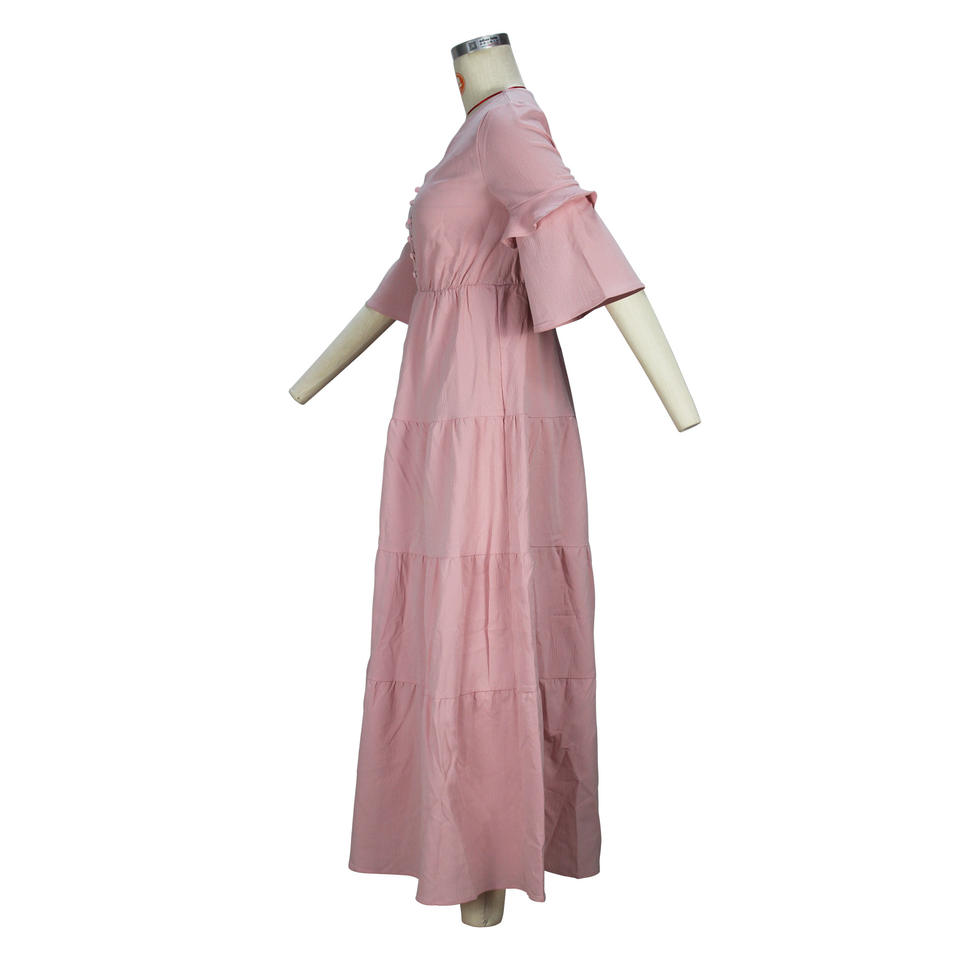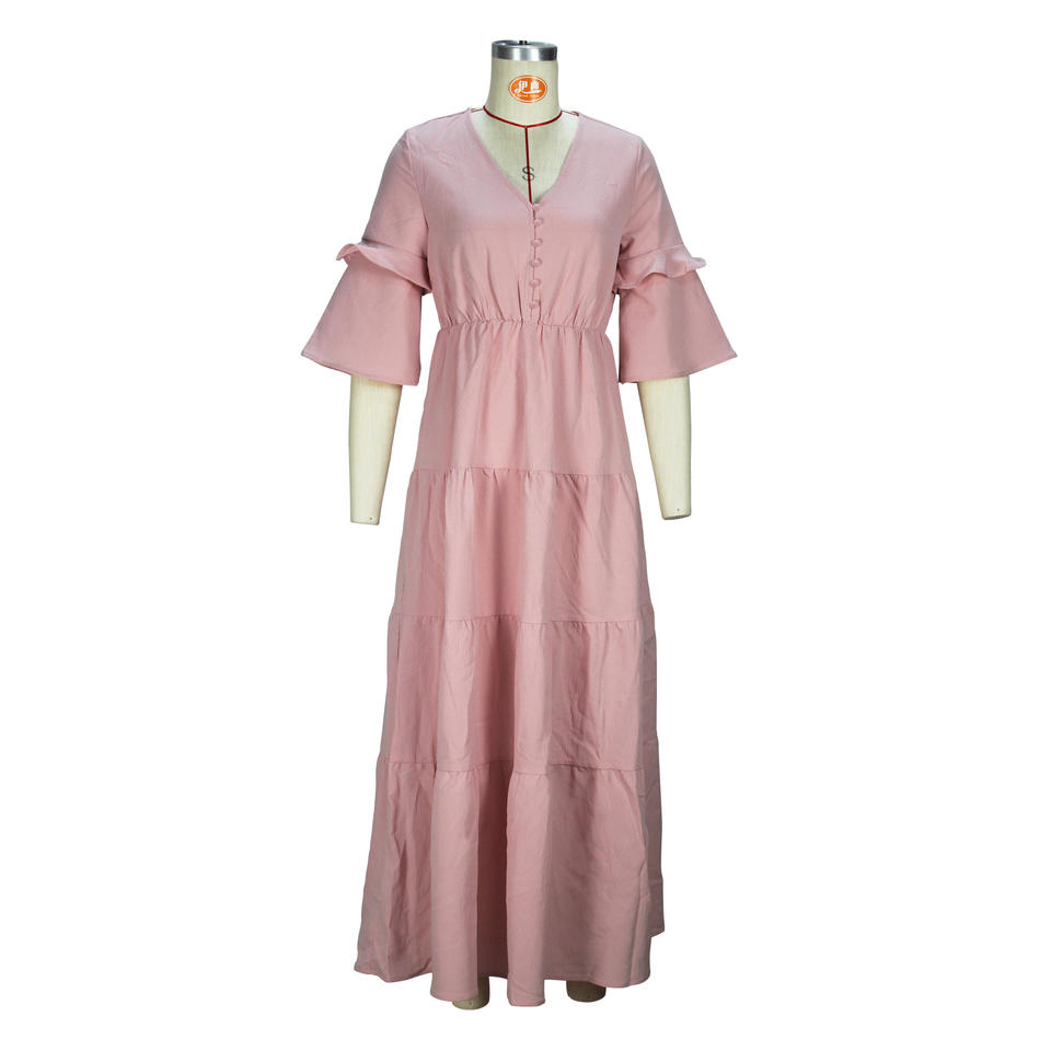 เดรสลำลองแขนระบายคอวีสีพื้นเรียบหรูสำหรับผู้หญิงแฟชั่น