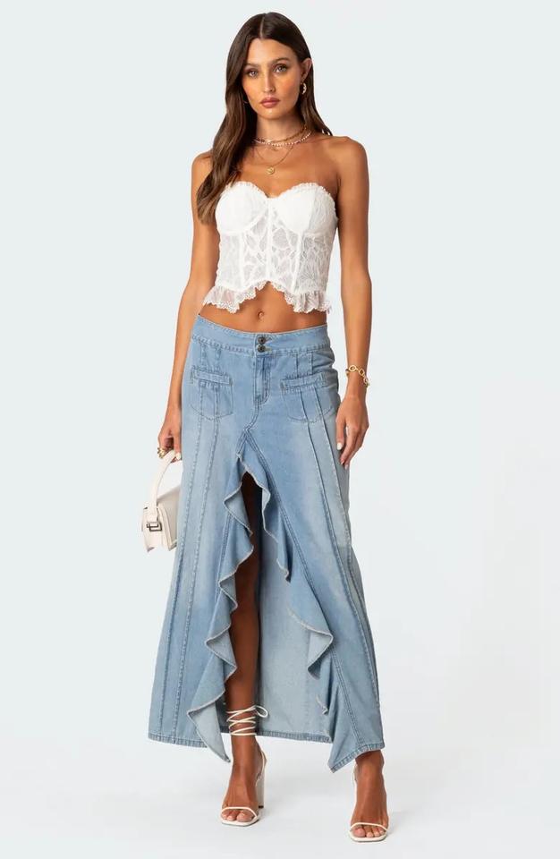 กระโปรงผ้ายีนส์ยาวปานกลางเอวกระโปรงยาวผ้าคอตตอนผ่าข้างสำหรับผู้หญิงกระโปรงยีนส์ยาวแบบกระดุมด้านหน้าสไตล์ลำลองไซส์ใหญ่พิเศษ