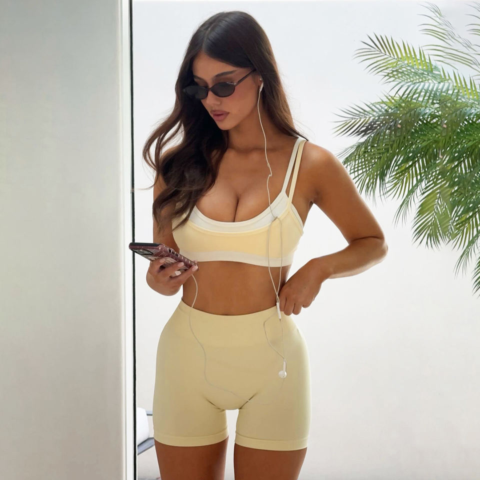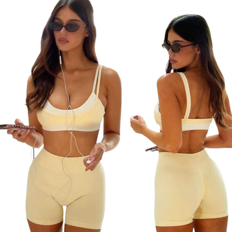ชุดเซ็ตสองชิ้นสีพื้นสไตล์สปอร์ตแคชชวลสำหรับผู้หญิง เสื้อครอปท็อป + กางเกงขาสั้นเอวสูง แห้งเร็ว เหมาะสำหรับโยคะและออกกำลังกาย