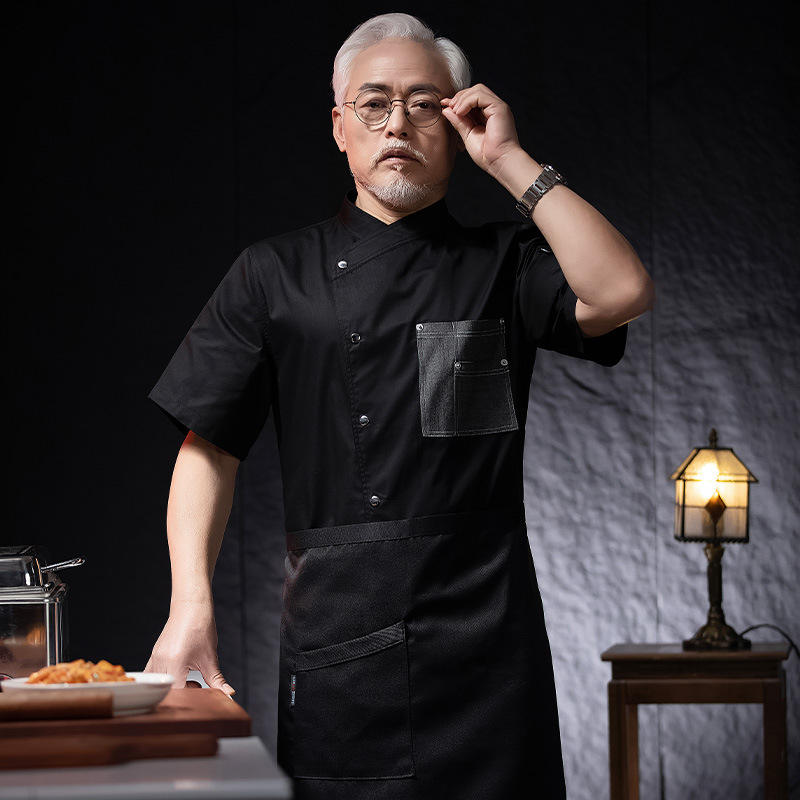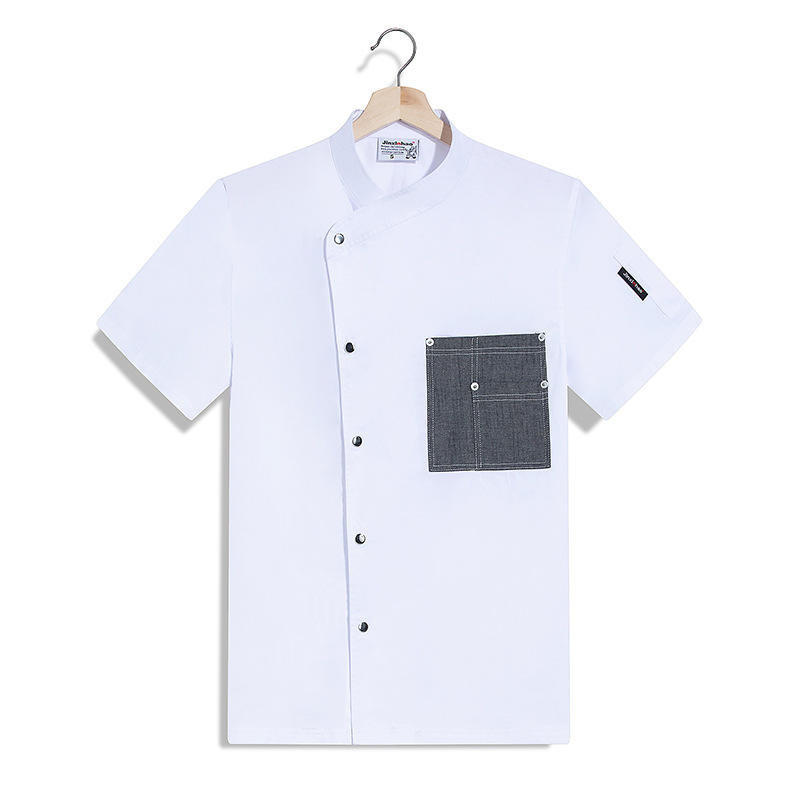 ชุดเชฟในร้านอาหารแขนสั้นแบบบางสำหรับฤดูร้อนสีพื้นระบายเหงื่อและระบายอากาศได้ดี