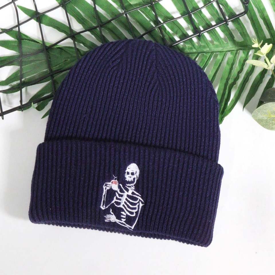 หมวกถักนิตติ้งสำหรับฤดูหนาวหมวกบีนนี่ปักลายตัวอักษรหัวกะโหลกหมวกอะคริลิค100% พร้อมโลโก้ออกแบบได้ตามต้องการ