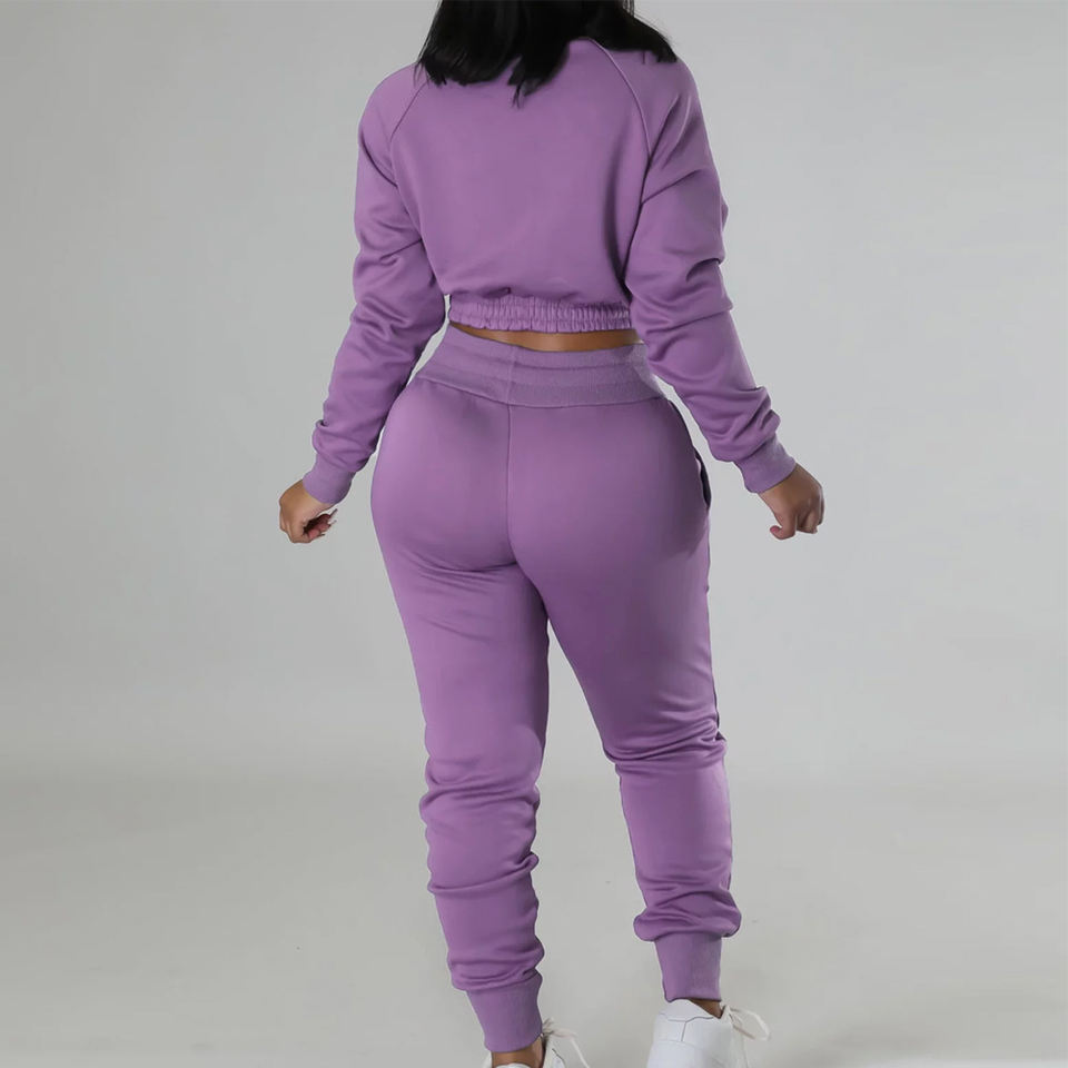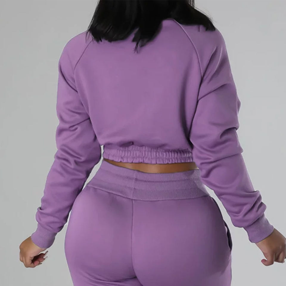 ชุดเซ็ตแทรคสูทผู้หญิงสีพื้น เหมาะสำหรับใส่ลำลอง ออกกำลังกาย และโยคะ ชุด 2 ชิ้น เสื้อครอปและกางเกงจ็อกเกอร์ ให้ลุคสปอร์ต