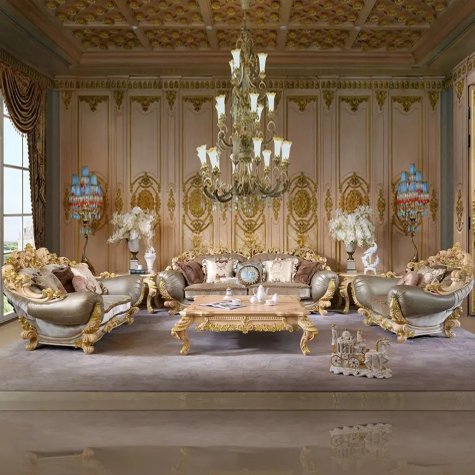 ชุดโซฟาห้องนั่งเล่นสไตล์ยุโรป ทำจากไม้มะฮอกกานีแท้ แกะสลักด้วยมือ หุ้มเบาะอย่างหรูหรา เฟอร์นิเจอร์คุณภาพสูง ผลิตในอินโดนีเซีย