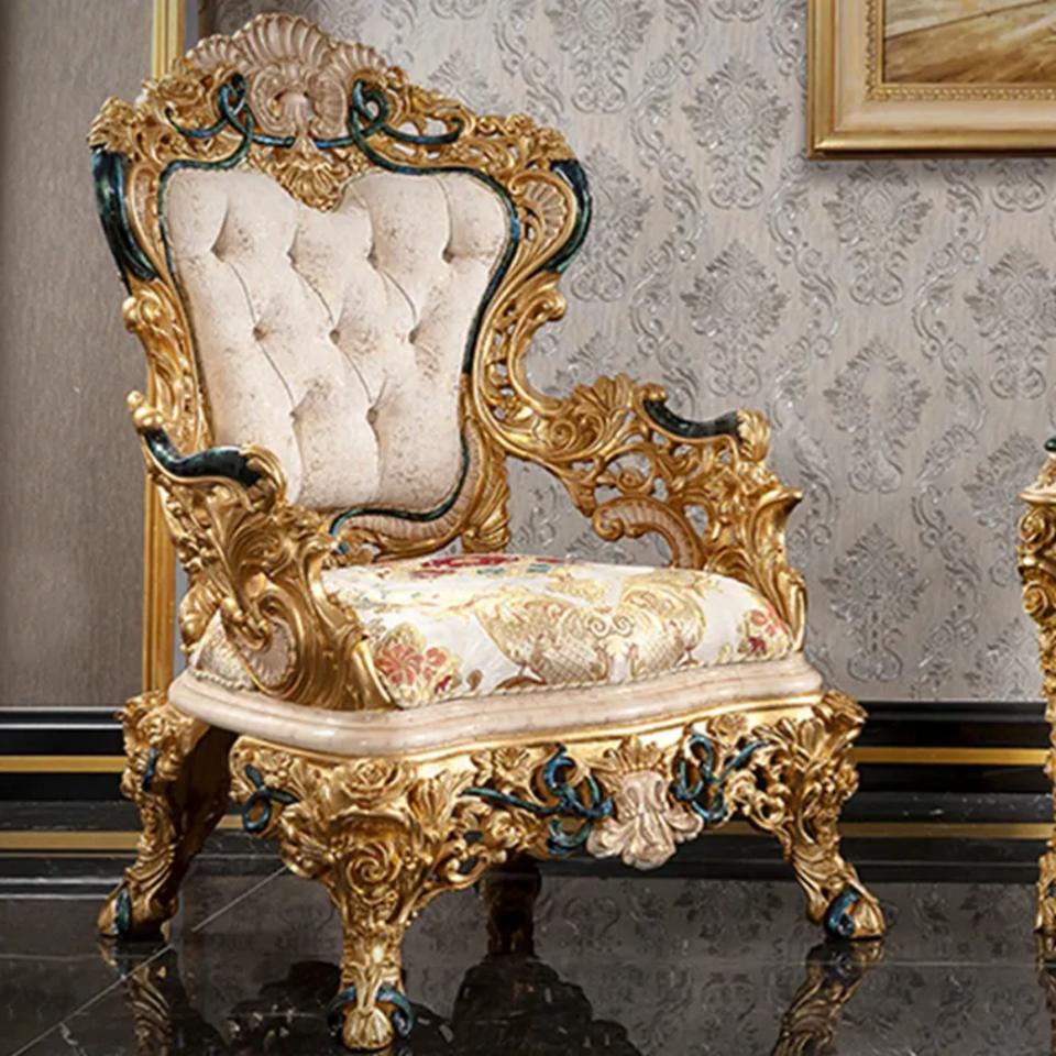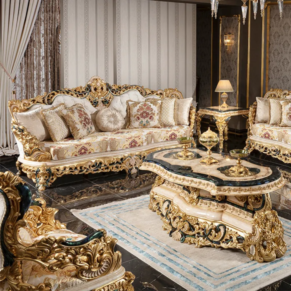 Solid Mahogany Wood French Sectional Sofa Set Eco-Friendly Upholstered Design Hand-Carved Details Luxury Living Room Furniture