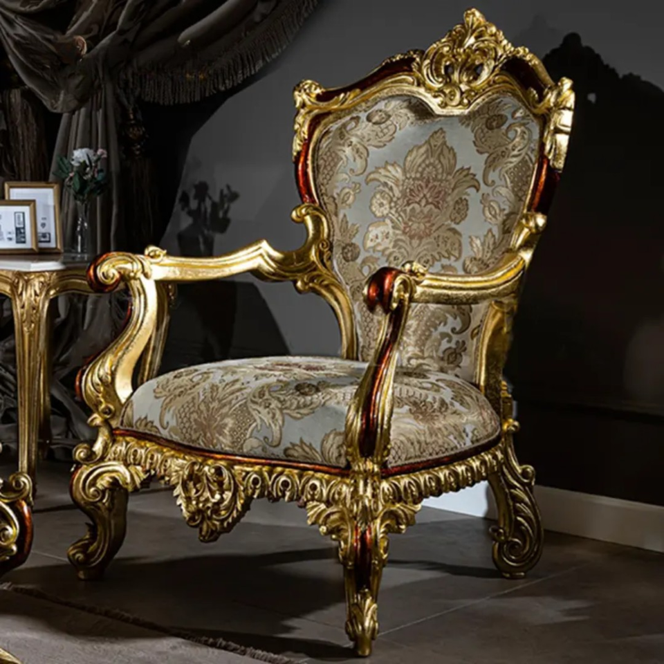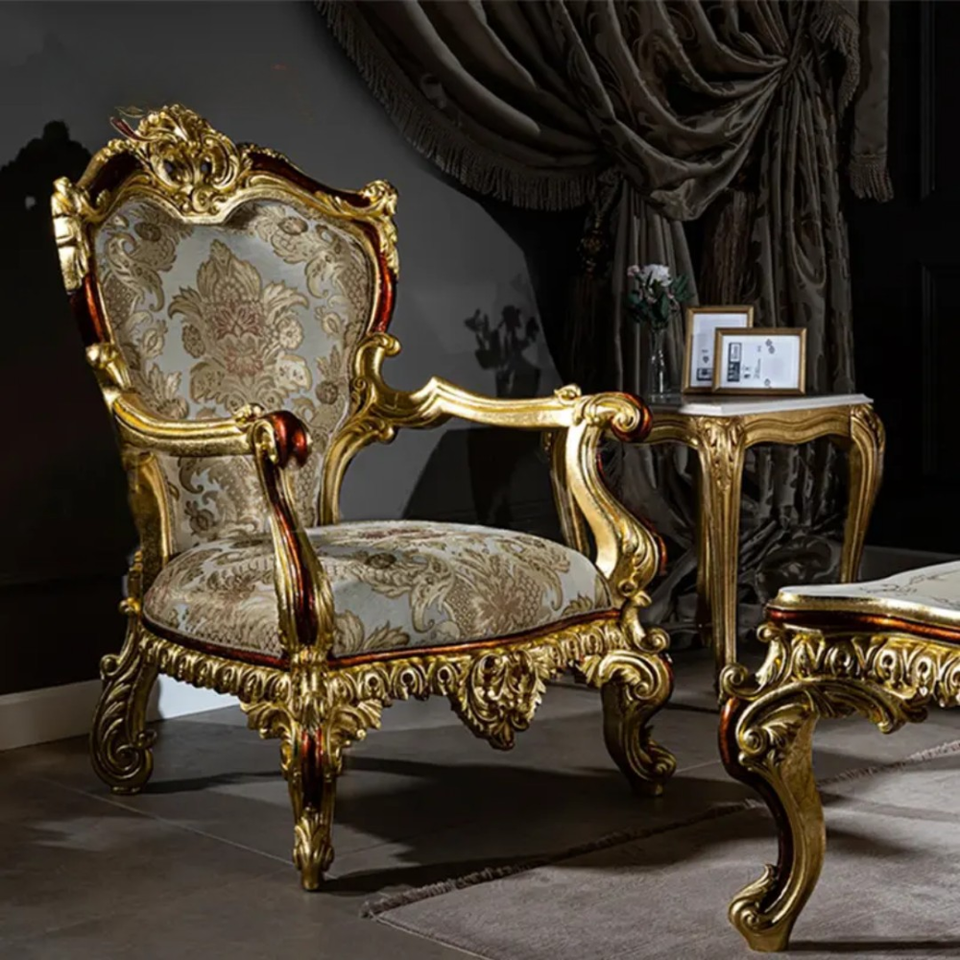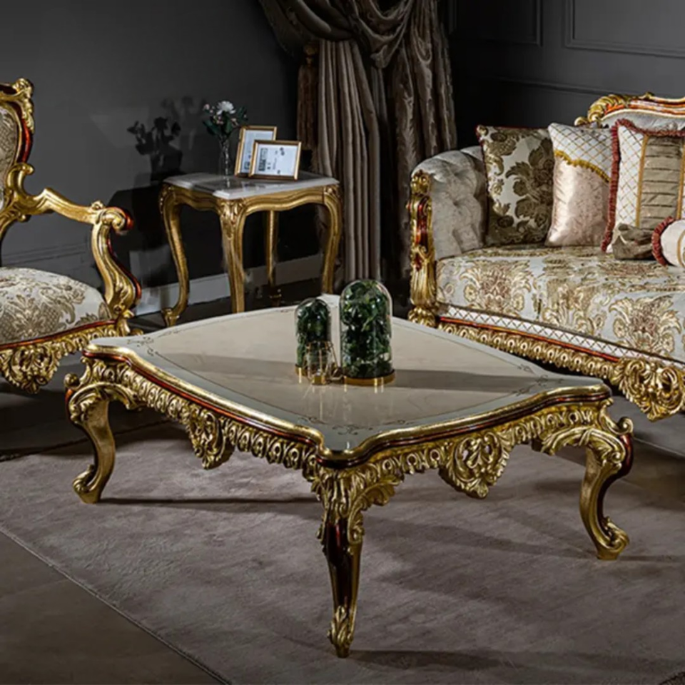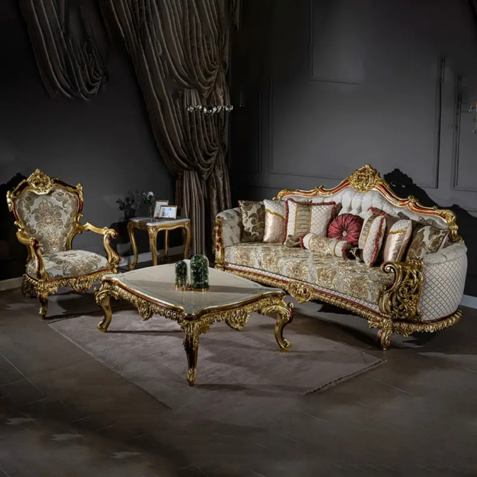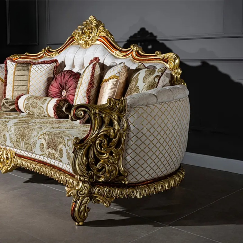 ชุดโซฟาห้องนั่งเล่นดีไซน์ฝรั่งเศสทรงสี่เหลี่ยม ทำจากไม้มะฮอกกานีเนื้อแข็ง แกะสลักด้วยมือ หุ้มเบาะอย่างหรูหรา เฟอร์นิเจอร์คุณภาพสูง ผลิตในอินโดนีเซีย
