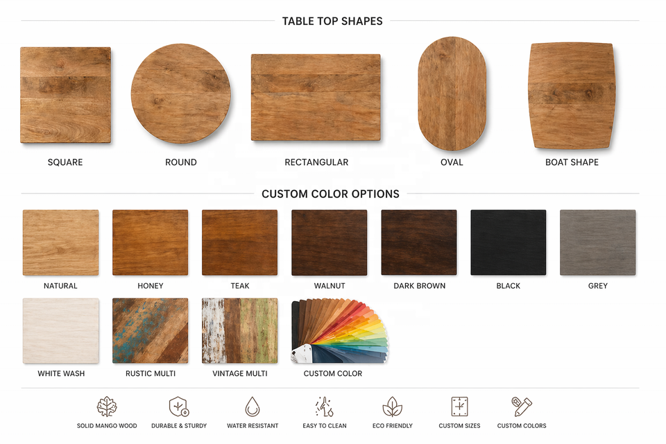 ท็อปโต๊ะไม้เนื้อแข็ง สีตามสั่ง เป็นมิตรกับสิ่งแวดล้อม ทนทาน กันน้ำ | โต๊ะร้านอาหารในร่ม/กลางแจ้งสำหรับธุรกิจโฮเรก้า | ขนาดต่างๆ