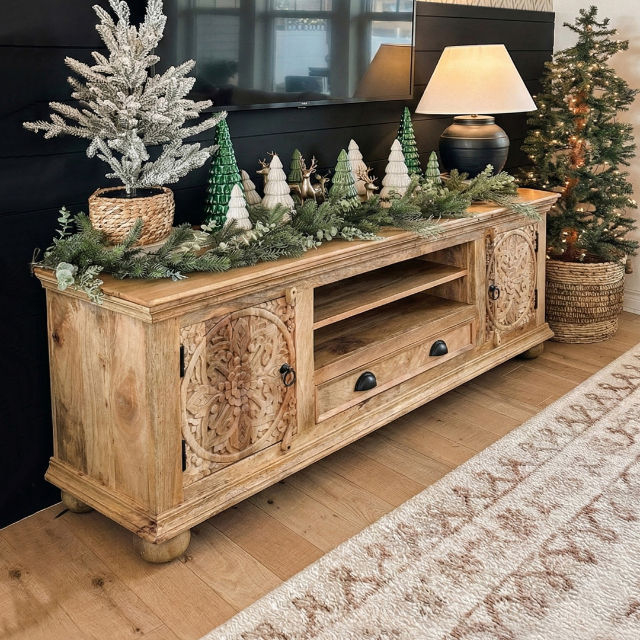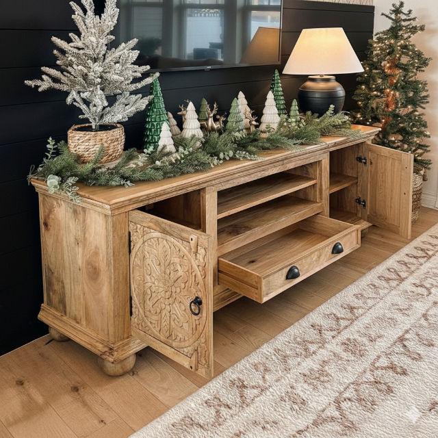 ชั้นวางทีวีไม้มะม่วงแท้ ดีไซน์โบราณแบบดั้งเดิม ทำด้วยมือ เป็นมิตรกับสิ่งแวดล้อม ทนทาน ใช้งานได้หลากหลาย พร้อมที่เก็บของ สำหรับห้องนั่งเล่น
