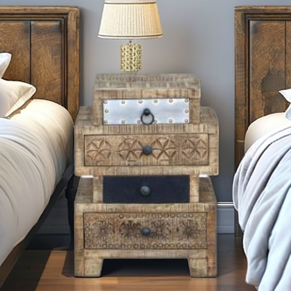 โต๊ะข้างเตียงไม้มะม่วงแท้สไตล์โบราณ 4 ลิ้นชัก เป็นมิตรกับสิ่งแวดล้อม เหมาะสำหรับห้องนั่งเล่นและอพาร์ตเมนต์