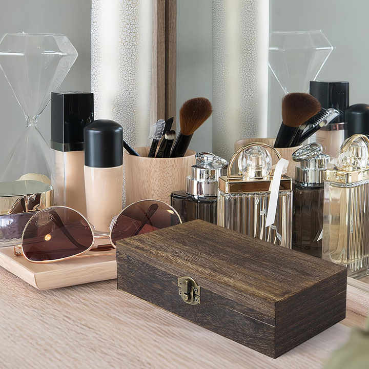 กล่องจัดเก็บเครื่องประดับทำจากไม้เผาสำหรับจัดระเบียบโต๊ะหรือเก็บเครื่องสำอาง