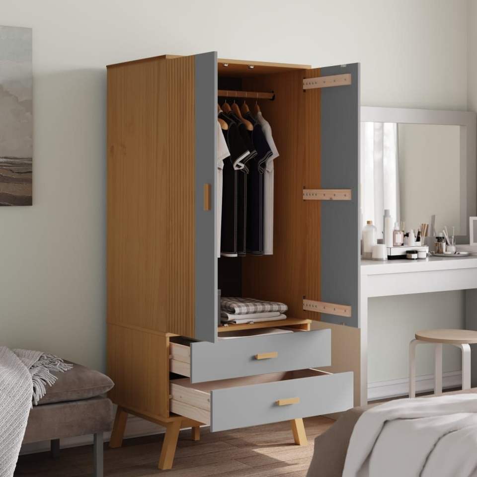 ตู้เสื้อผ้าไม้สนสีเทาและสีน้ำตาล ผลิตจากวัสดุวิศวกรรม สวยงามและทนทาน