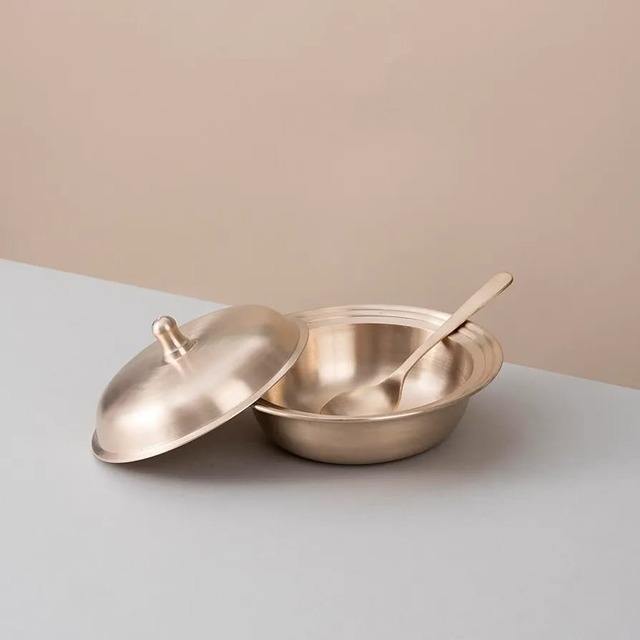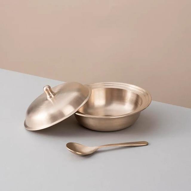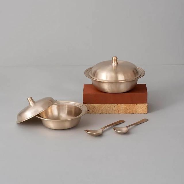ชามเสิร์ฟพร้อมช้อนชุด2ชิ้นทำจากโลหะบรอนซ์ทำมือมีประโยชน์แบบอายุรเวทสำหรับเสิร์ฟ