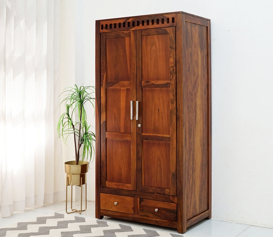 ตู้เสื้อผ้าไม้ชีแชมแท้สไตล์วินเทจโบราณแบบอินเดีย สีฮันนี่ สำหรับจัดเก็บของในบ้าน ประกอบสำเร็จแล้ว