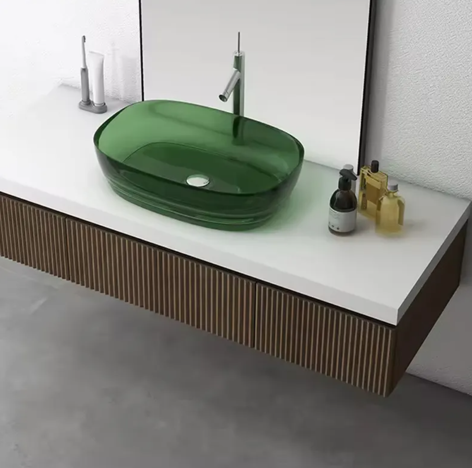อ่างล้างจานแบบใสทำจากเรซินเนื้อแข็งดีไซน์ทันสมัยสำหรับใช้ในโรงแรมอ่างล้างหน้าแบบโปร่งแสงพร้อมท่อระบายน้ำ