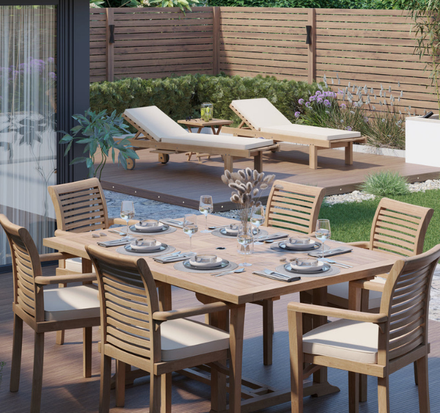 ชุดโต๊ะรับประทานอาหารกลางแจ้งทรงสี่เหลี่ยมผืนผ้า ทำจากไม้สักแท้ ทนทานต่อสภาพอากาศ เป็นมิตรกับสิ่งแวดล้อม พร้อมเก้าอี้มีพนักแขน 6 ที่นั่ง ตกแต่งแบบธรรมชาติ เหมาะสำหรับโรงแรมและวิลล่า