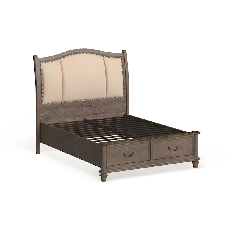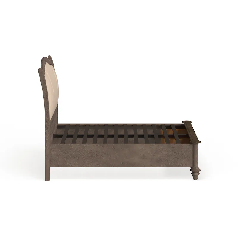 ชุดเตียงคิงไซส์ไม้สักแท้จาก Java Wood Furniture พร้อมโต๊ะข้างเตียงแกะสลักด้วยมือ สีเทาแบบเรียบง่าย เตียงพร้อมที่เก็บของ หุ้มเบาะสไตล์ดั้งเดิม
