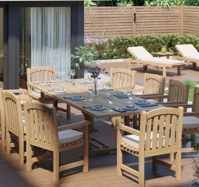 ชุดโต๊ะรับประทานอาหารกลางแจ้งทรงสี่เหลี่ยมขนาดใหญ่ ทำจากไม้สักแท้ พร้อมเก้าอี้มีที่วางแขน ตกแต่งแบบธรรมชาติ เหมาะสำหรับสวน ลานบ้าน หรือวิลล่า
