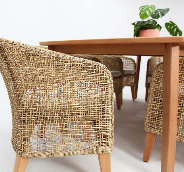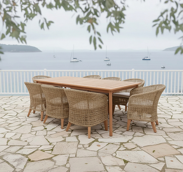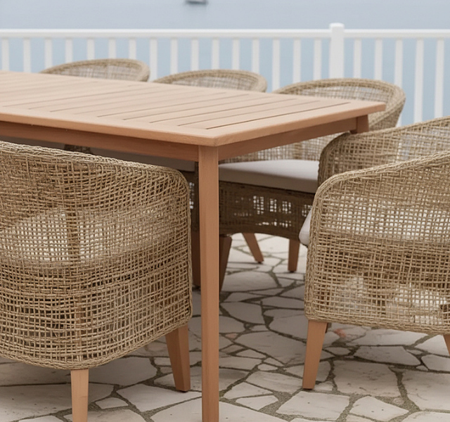 ชุดโต๊ะรับประทานอาหารกลางแจ้งไม้สักแท้ ทนทานต่อสภาพอากาศ เป็นมิตรกับสิ่งแวดล้อม พร้อมเก้าอี้หวายสังเคราะห์ ดีไซน์ทันสมัย เหมาะสำหรับสวน ลานบ้าน โรงแรม