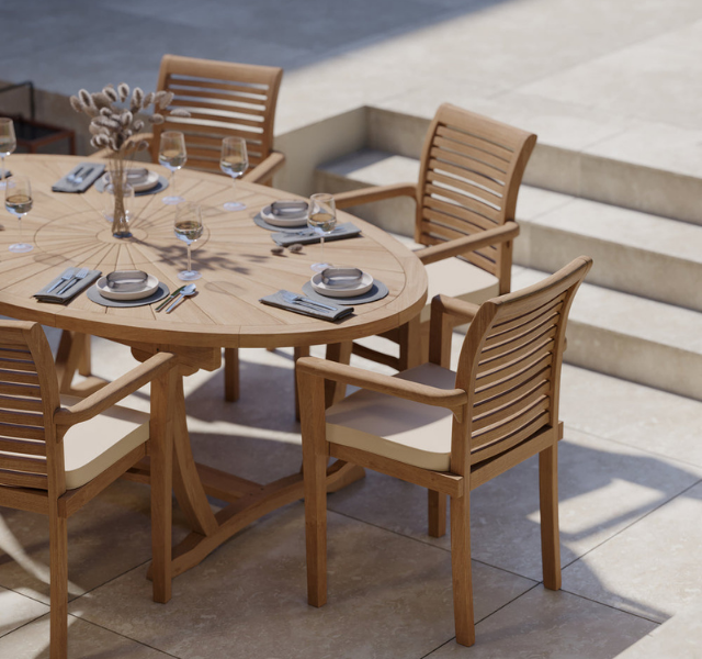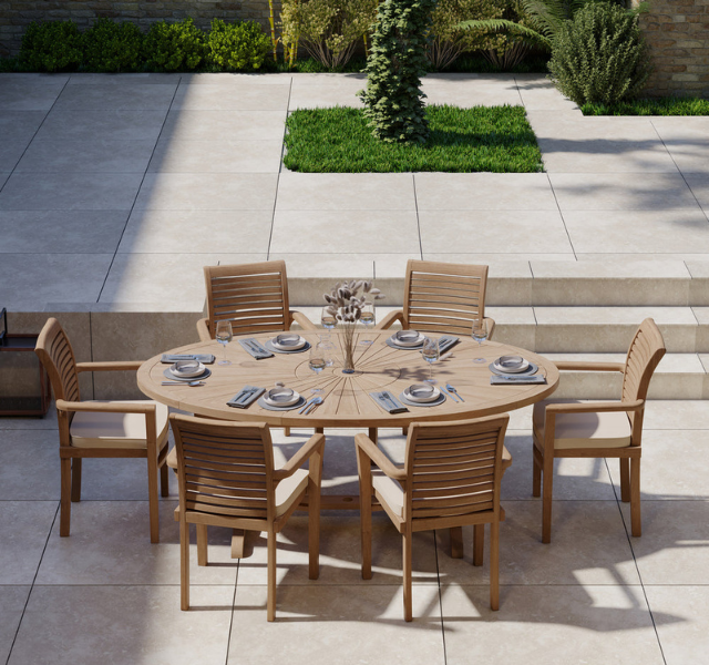 ชุดโต๊ะรับประทานอาหารกลางแจ้งทรงกลมไม้สักแท้ 6 ที่นั่ง พร้อมเก้าอี้มีที่วางแขน ตกแต่งแบบธรรมชาติ เฟอร์นิเจอร์หรูหราสำหรับสวนและลานบ้านสำหรับวิลล่า