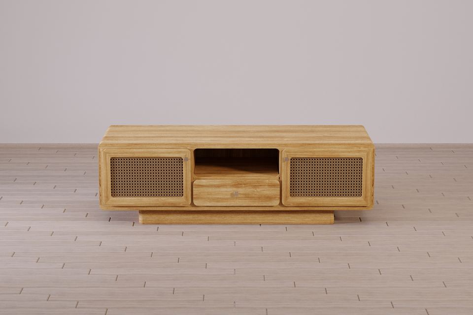 René โต๊ะทีวีไม้สักเนื้อแข็งพร้อมสำเนียงหวายสีธรรมชาติสำหรับรับประทานอาหารในห้องนั่งเล่น