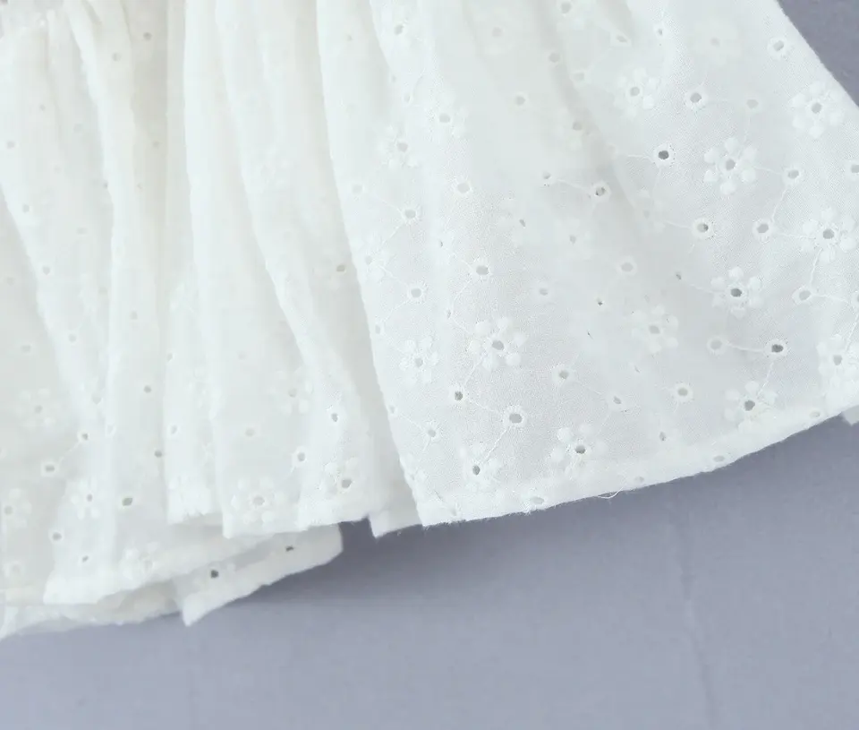 มินิเดรสคอเหลี่ยมสีขาวล้วนสำหรับผู้หญิงปักแขนสั้นผ้าทอแบบเรียบง่ายระบายอากาศได้ดีฤดูร้อน