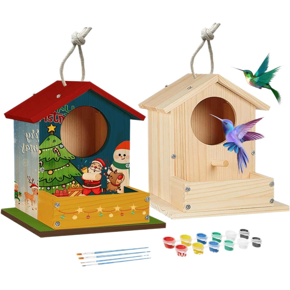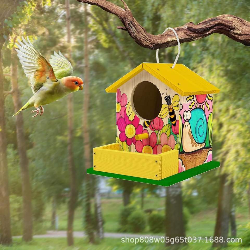 บ้านนกไม้เนื้อแข็งทรงสี่เหลี่ยมผืนผ้าสีธรรมชาติทนทานสำหรับพื้นที่อยู่อาศัยของนกในสวนกลางแจ้งขนาดเล็ก