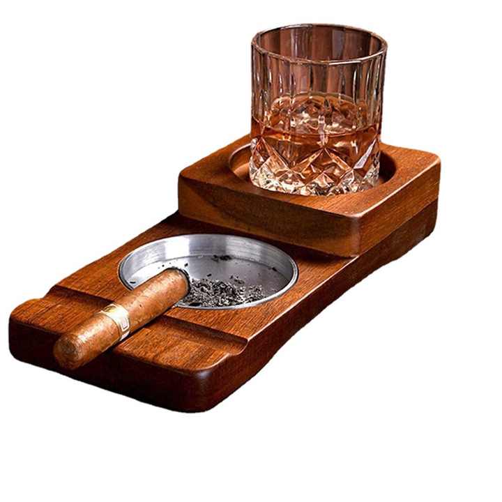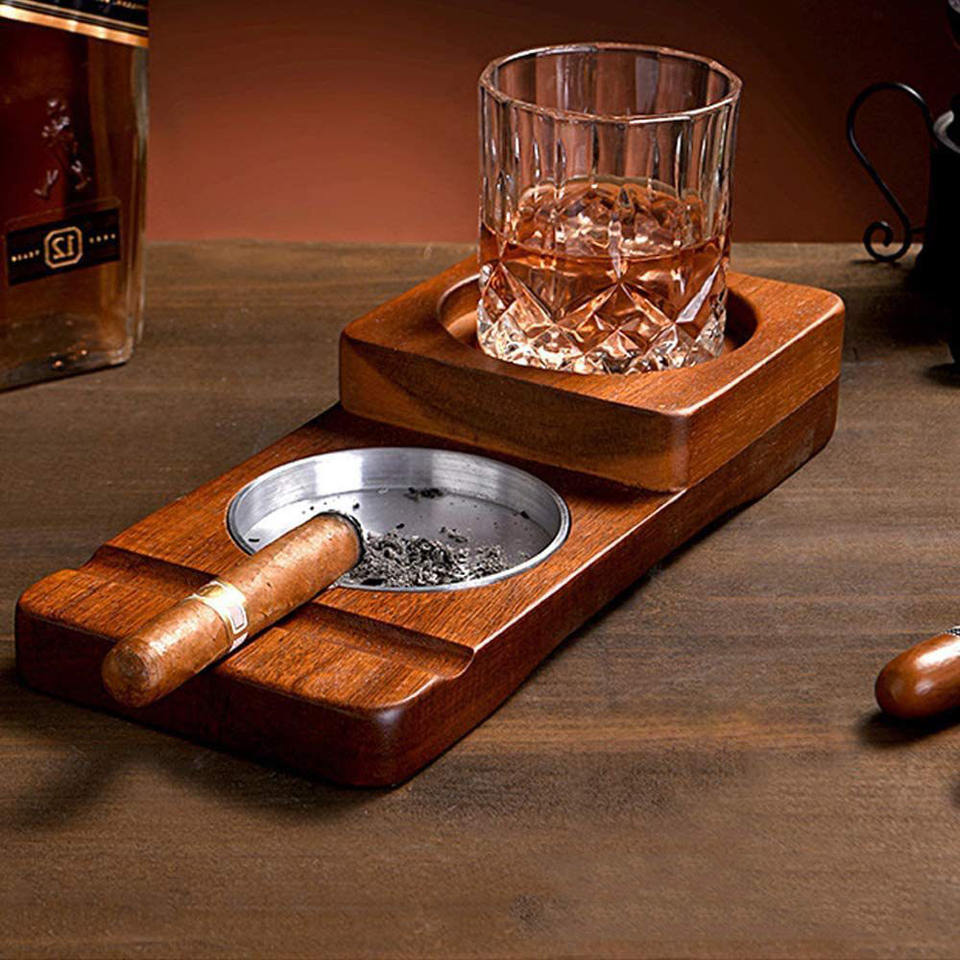 Solid Wood Cigar Ash Tray Elegant Wooden Cigar Holder with Whiskey Glass Tray Bar Business and Men's Gift Cigar Accessories
