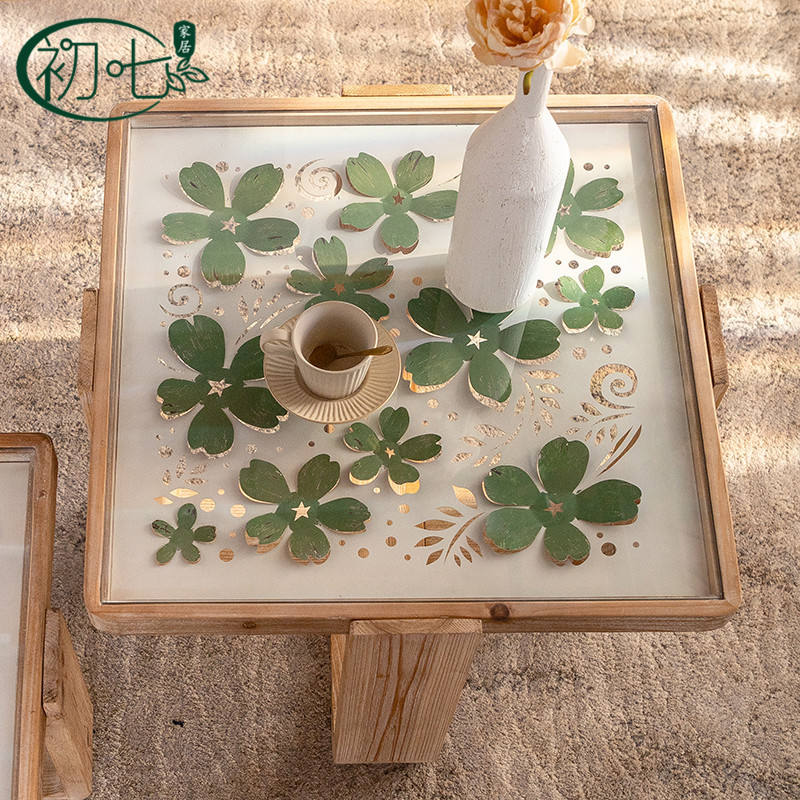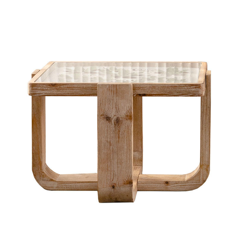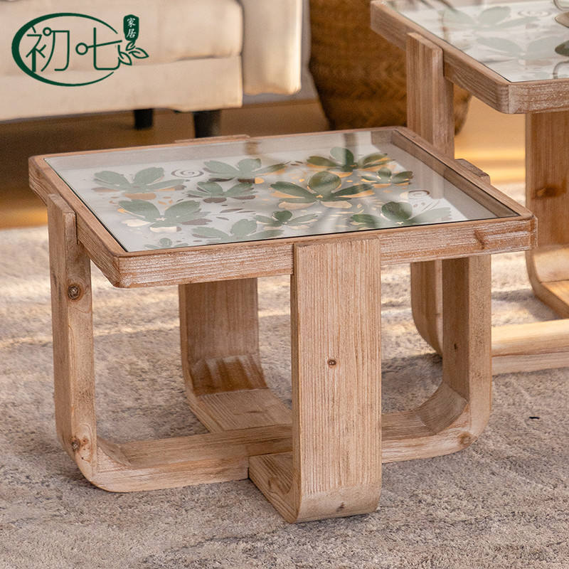 โต๊ะกาแฟไม้เนื้อแข็ง ท็อปกระจก ผิวแบบดิสเทรส โต๊ะข้างห้องนั่งเล่นสำหรับอพาร์ทเมนต์ขนาดเล็ก รุ่น H2487