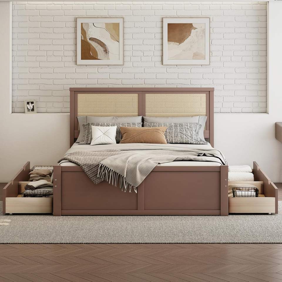เตียงเก็บของขนาดใหญ่ทำจากไม้เนื้อแข็ง พร้อมลิ้นชัก 4 ช่อง โครงรองรับแบบไม้ระแนง และหัวเตียงหวาย สำหรับห้องนอน/ห้องพักแขก