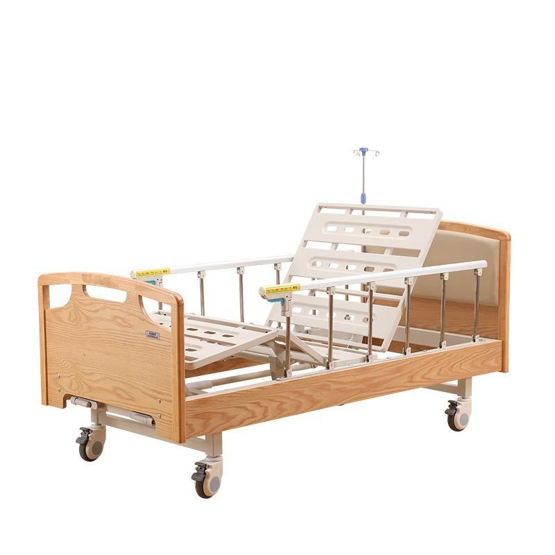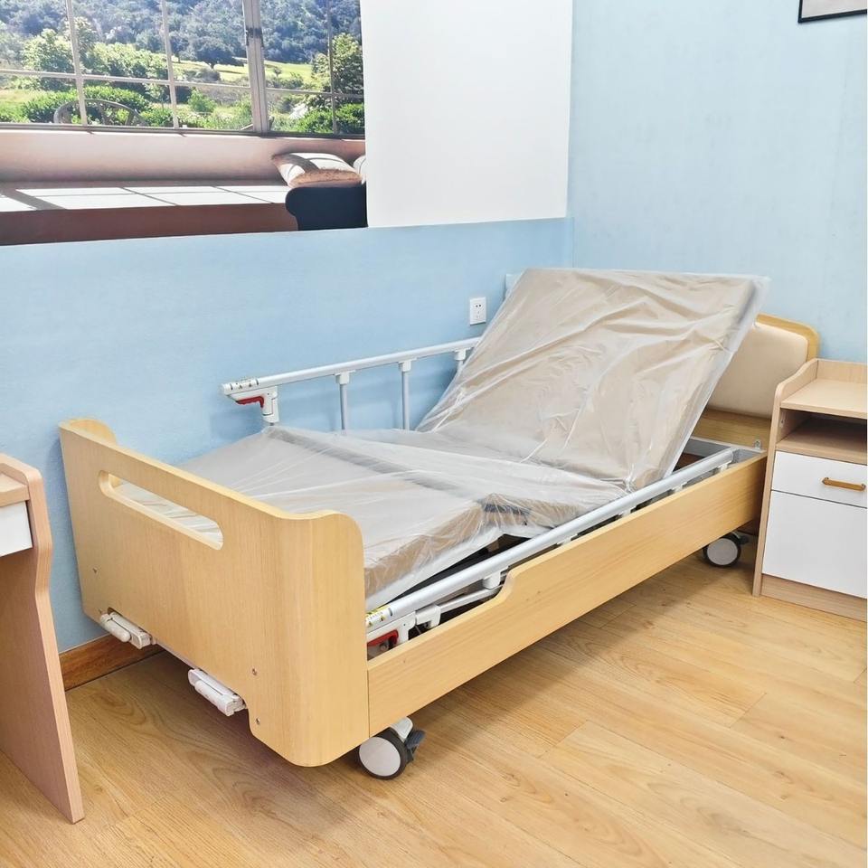 เตียงผู้ป่วยแบบปรับระดับด้วยมือพร้อมหัวเตียงไม้จริง ปรับยกขาและปรับความสูงได้ เหมาะสำหรับใช้ในบ้านพักคนชรา