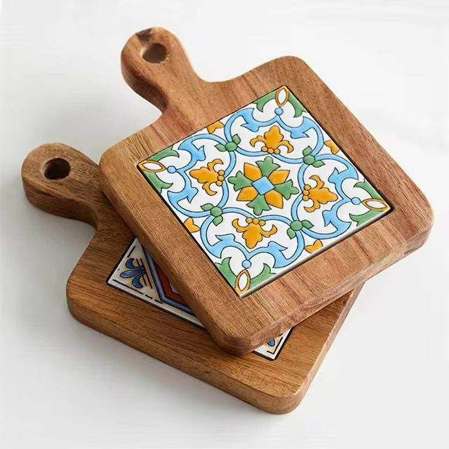 แผ่นรองแก้วไม้เนื้อแข็งแผ่นปูกระเบื้องญี่ปุ่นใช้ในครัวเรือนแบบย้อนยุคแผ่นรองจานกันความร้อนในครัวทนทานต่ออุณหภูมิสูง