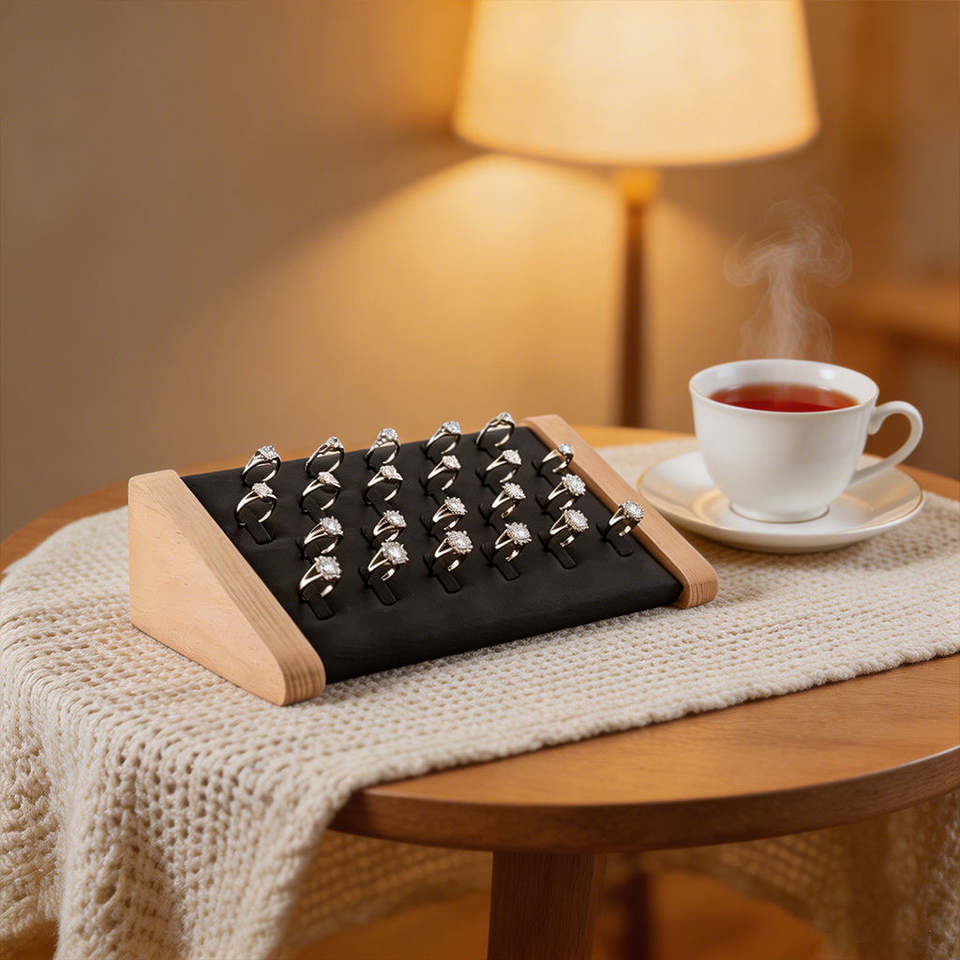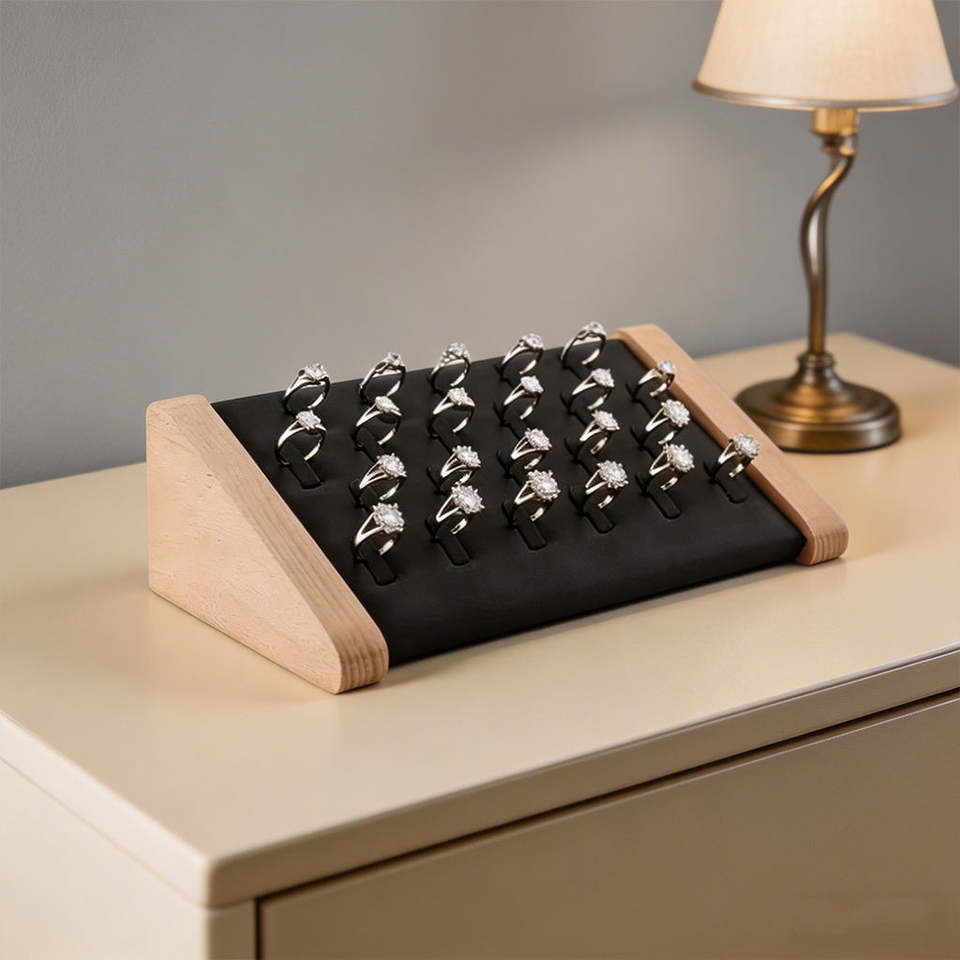 ถาดเก็บเครื่องประดับไม้เนื้อแข็งหุ้มหนังสำหรับโชว์ต่างหู จี้ และเครื่องประดับอื่นๆ