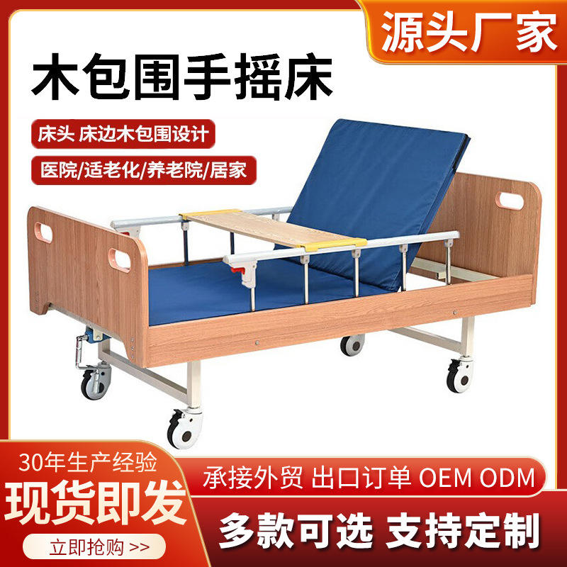 เตียงผู้ป่วยไม้เนื้อแข็งแบบปรับมือพร้อมโครงเหล็กและล้อ สำหรับการดูแลที่บ้านและการใช้งานทางการแพทย์