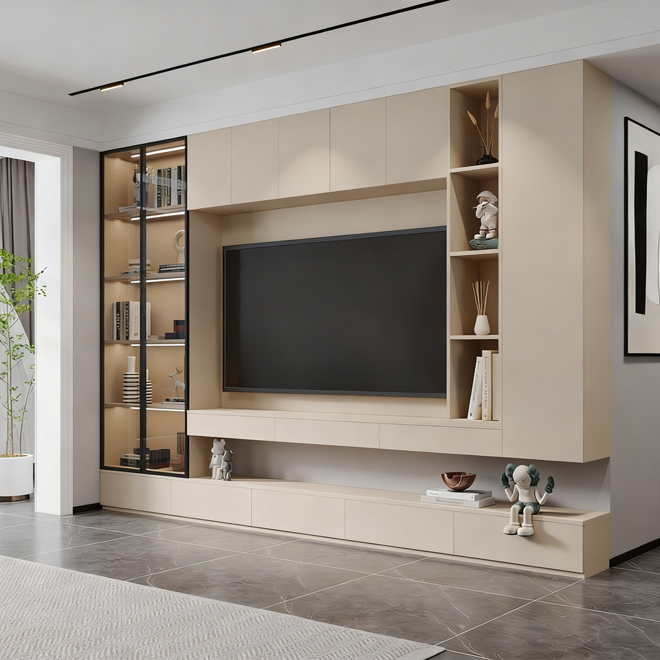 ชั้นวางทีวีไม้เนื้อแข็งพร้อมไฟ LED อบอุ่นในตัวและชั้นวางแบบเปิด สร้างบรรยากาศห้องนั่งเล่นที่อบอุ่น ราคาดีที่สุด รองรับทีวี