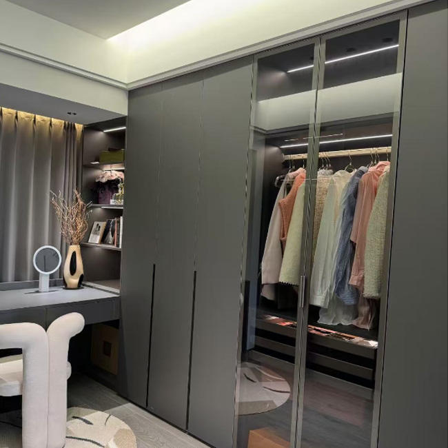 ตู้เสื้อผ้าไม้เนื้อแข็งสำหรับบ้านห้องนอนเช่าไฟหรูหราประตูกระจกหนาตู้เสื้อผ้าออกแบบได้ตามต้องการ